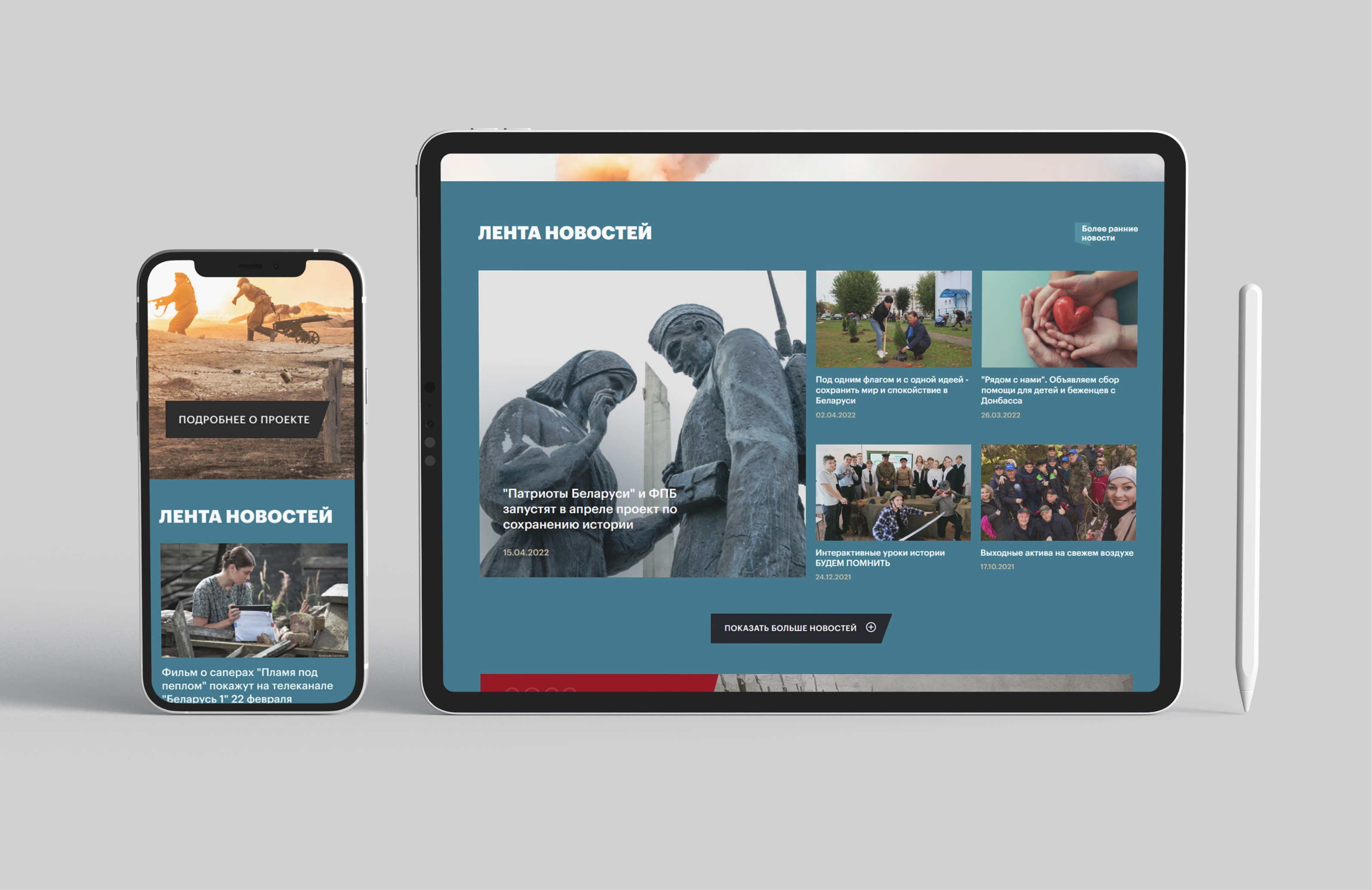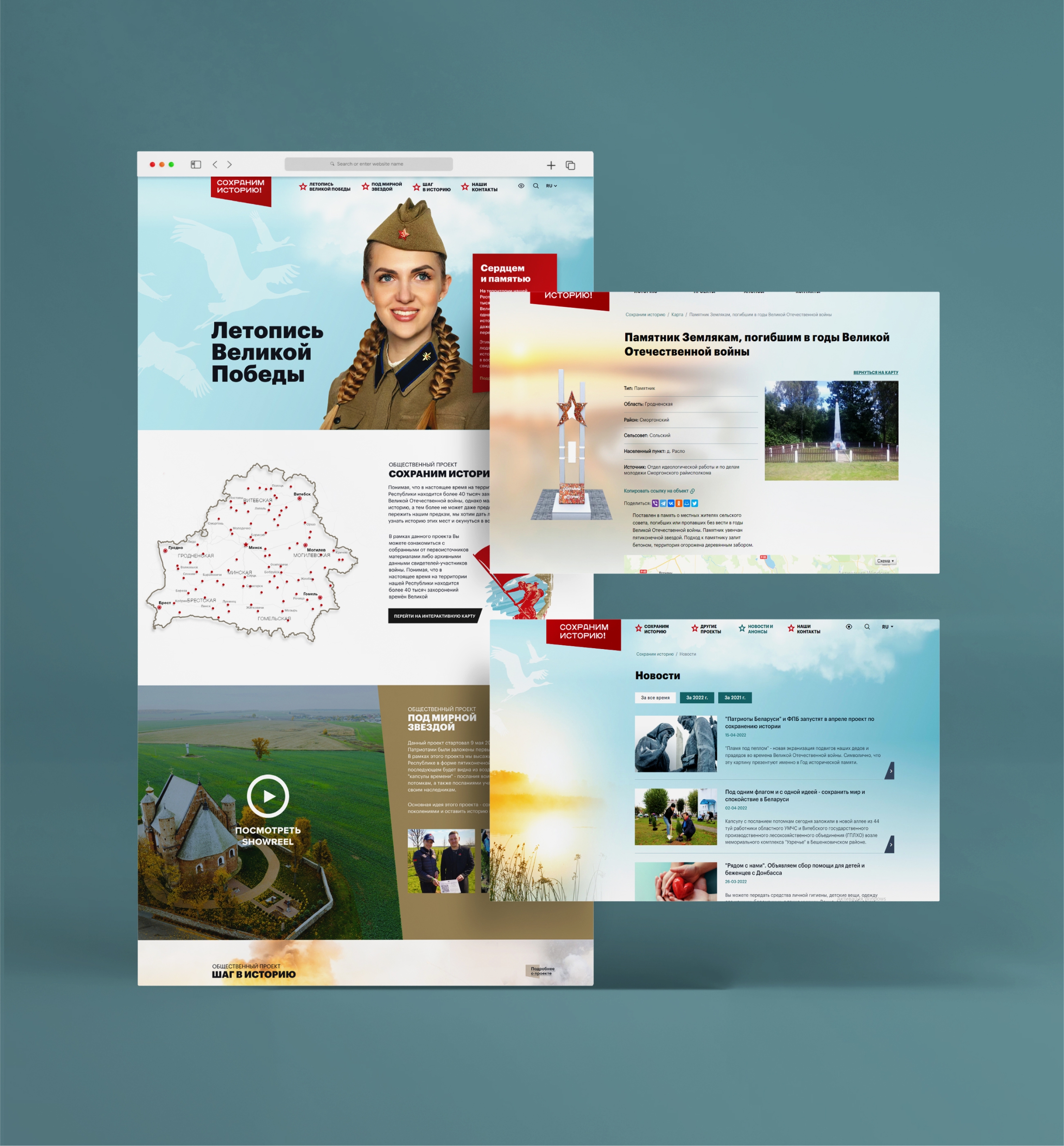 Сайт Savehistory.by объединяет все наши проекты, посвященные Великой Отечественной войне: Сохраним историю, Под мирной звездой и Шаг в историю.Мы аккумулируем контент по этой теме на одной площадке для удобства продвижения в поисковых сервисах и социальных сетях, а также в целях экономии ресурсов. Промо-блоки и справочная часть разделены, чтобы понятнее и зрелищнее подать суть идеи людям, впервые пришедшим на сайт. Сайт адаптивен на различных устройствах, имеет версию для слабовидящих.